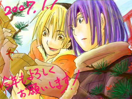 | うひゃぁ〜♪この素敵楽しいヒカアキお年賀状は、アキヒカアキサイトの『慰めなんていらないっ!』の慧さまからいただきました♪ 「イヤン♪進藤ったら素敵。んで絵馬に何書いたの?」 と思いましたら、続きが下にっ! あはははは☆流石慧さんだ! 見事にオチかましてくれました(笑) 進藤・・アンタ年頭の願掛け・・・・それかよっっ?! タイトル戦への抱負とかじゃなくってさ、やっぱアキラさんなんだね? ・・・・っつかさ、『神の一手を極める』んじゃなくって『48手を極める』のが先決なんだね・・・(ハンカチで目頭押さえつつ) 「希望」と言いますか「野望」とでも言いますか「無謀」とでも言いましょうか・・・・(笑) ああ・・・でもこんなおバカ進藤、好きです。 今年も進藤ったらアキラさんの手の平の上で、思う存分転がされるがいいさ! いつも素敵なヒカアキ・アキヒカ漫画・イラストで私たちを楽しませてくださってありがとうございます。 なんといいますか、アキヒカとヒカアキの描き別けがこれほどすっぱりとに出来るなんてお見事!といつも思います。 ほんの僅かな表情で別れるもんなんだなあ・・・・と感服しております。 学業がお忙しい中で次々と描かれるイラストや漫画に、いつも幸せのおこぼれを頂戴しております。 ありがとうございます。 そして先日11月5日のヒカ碁オンリーで美麗ヒカアキイラストを頂きましたので、↓に展示させて頂きますね。 今年もどうかよろしくお願い致します。 ありがとうございました。 2007年1月1日 |