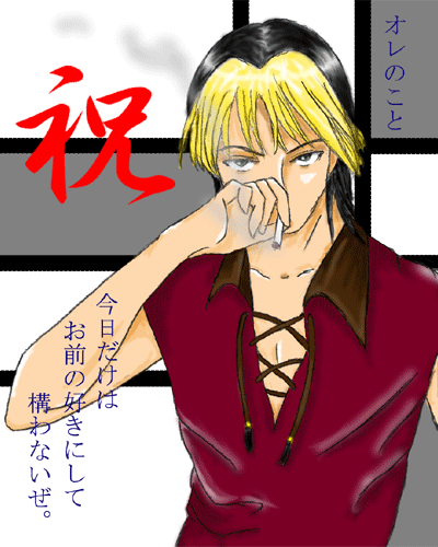 | という妄想がこのイラストを拝見した瞬間に浮かびまして(笑)だかだかと打たせていただいたのでした。 きなみさん、その節はこんなエロカッコいい進藤を寄越して下さってありがとうございました。 あれからずっとおいらの懐に温めていたんですけど(をい)やっとページを作って皆様にお披露目する気になりまして(笑)。 そんな素敵進藤を描かれるきなみさん。 素敵ヒカアキ小説を書かれます。 きなみさん、ありがとうございました。 2007年9月3日 |