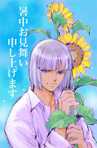 | ひゃっほ〜〜♪「フリー暑中お見舞い」を頂いて参りましたよ〜!(強奪とも言う) 珍しい、イザークの私服姿であります。 ラフなシャツを羽織ってはいても、凛としたたたずまいを感じさせる辺りは流石ですね。 彼の持って生まれた気性や気高さゆえなのかも知れませんが、 そこら辺にディアッカは参っちゃったのかなあ・・・・とかあれこれ考えちゃうワケです。 こんな無防備に柔らかい笑顔を見せるのはディアッカの前だけででしょうしね♪ 素肌に軽く羽織ってらっしゃるこれって「彼氏シャツ?」 肩幅やら袖口やらにゆとりが感じられるのが非常に萌えでございます。 そして視線の先にいるであろう、ディアッカ。 きっと眉毛、下がりっぱなしなんだろうなあ・・・・と思うと、こちらまで幸せな気持ちに なって参ります。 そしてこのページをUPしました、本日8月8日は、イザークのバースデーなのであります♪ 隊長――っ!おめでとうございます! きっと今宵は二人きりの素敵な一夜を過ごされるのでしょう♪ くるめ様、ありがとうございました。 2008年 夏 |
