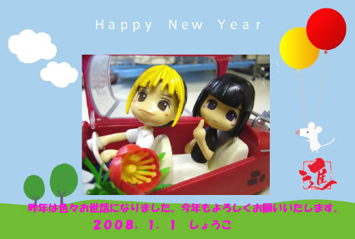 | この”いちゃいちゃ♪ドライブ・ヒカアキ年賀状”はヒカアキサイト『One』のしょうこ様からいただきました。 ちょっと得意げな表情のヒカルが微笑ましいです。(アキラさん、「よそ見するな、進藤―っ!」と後ろでハラハラ?) 昨年はピンキータイフーンが吹き荒れました、このヒカアキ界。 イベント会場でも、このちびっ子なふたりにあちらこちらでお会いしました。 ドールやコス・・・・・イベントが華やかになっていいですね♪ しょうこさんには、オフにオンに、いつも素敵な企画で楽しませていただきありがとうございます。 また今年もよろしくお願い致します。 |