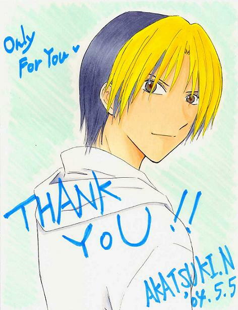 | このイラストはヒカアキサイト様『Only』の管理人『日烏朱月』様からサイト開設お祝いに頂きました。 管理人様のお名前ですが私はどちらかというと『透吾さん』のほうが馴染みがありますので、こちらで呼ばせて頂きますね。 ヒカル〜〜〜カッコイイ!このキリッとした瞳・・・そして私にだけ向けられているんだ!としか思えない様なこの微笑♪ 透吾様の描かれる進藤は原作にとても近いので、いつもドキっとしてしまいます。もうめろめろです・・・・・。透吾さん、素敵過ぎですよ! 透吾さんとは2月のラブトレで初めてお会いしまして、その時からメール等でちょくちょくやり取りをさせていただいております 仕事中疲れてしまって『ふぅ〜〜』な時に『とりとんぼうずさん、お元気ですか?!透吾です!』と元気にケータイメールにイラスト(モチロン進藤)を添付して送ってきてくださったり、『今大阪のインテに居ますが、何か欲しい本はありませんか?』などメールを下さったりと、とても優しい方です。私はいつも透吾さんからのメールで、元気を頂いております。 お互い住んでいる土地が離れていますので、ヒカアキにハマっていなければ恐らくはお会いする事もなかったでしょう。 こういったご縁をこれからも大切にしてゆきたいと思っています。 透吾さん、いつもありがとう。これからもよろしくね♪ 素敵なイラストをありがとうございました☆(なお管理人、スキャナーの使い方がいまいちよくわかっておらず、せっかくの透吾様の綺麗な主線が点々に・・・・またちゃんとスキャンできましたら、差し替えたいとおもいますのでお待ちください)ぺこり☆ |