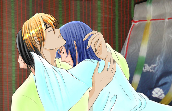 | 「ちょっ・・・・っ・・・・こ・・・のえっ!」 性急に唇を合わせてくる彼。 まだその行為に慣れていない僕はどうしても恥ずかしさが先に立ってしまって つい顔を逸らしてしまう。 それにいくら庭とは言え、外は外だ。 いつ誰がやって来るとも知れない。 しかし、近衛に顔を手で挟まれしっかりと唇を塞がれる。 もがくと更にきつく抱き締められた。 貪るように僕を求めてくる。 あまりの激しさに息を付く暇もなく、ただ彼の求めに応えるのに必死だった。 『賀茂、逢いたかった!』 「うん・・・・・・」 『はぁ〜〜〜〜〜!もうオレ限界!』 「近衛?」 『お前と離れて半年だぜ。お前の顔は見れないわ、 声は聞けないわ触れないわ・・・・オレ死ぬかと思った』 「ばか・・・・」 そっと近衛の肩口に顔を寄せる。 戦は激しかったと聞く。 茶化してはいるが、死者もかなり出た厳しいものであった。 ―――よくぞ無事で――― そう思うと賀茂の胸には、切なく迫るものがあった。 戦場での近衛の安否が気になり眠れない夜をいくつも重ね 時には涙で枕を濡らすこともあった。 「君がこうやって生きて・・・・無事に帰ってきてくれて嬉しい」 自ら己の首に腕を回し、唇を重ねてきた賀茂に近衛の身体は一気に熱を帯びる。 『賀茂・・・・抱きたい 今すぐ 我慢出来ないよ、オレ・・・』 「近衛!ぼくは・・・・」 『オレ、もうずっと我慢してた。お前は?オレとそうなるのはイヤ?怖い?』 真剣な近衛の顔が目の前にある。 そんな顔をさせているのは自分なのだと思うと切なくもあり、また嬉しくもある。 お互いの想いを告げあったのは、彼が戦地に赴く前のこと。 唇を触れ合う程度のことはしていた。 けれどその先にどうしても進むことが出来なかったのは賀茂で。 近衛を待たせてしまったという自覚は十分にある。 そのような経緯があったにしろ無かったにしろ、恋人からこんな熱い瞳で求められて、拒める人がいるだろうか? 「近衛、奥へ…」 『え?いいのか?』 「君の怪我の手当てをしてからだ」 『な、何でわか…』 「君からわずかに血の匂いがする」 『手当てはしてもらったよ』 「応急処置だろう?ちゃんと傷口を消毒しなければダメだ!どんな傷でも手当てを怠れば後で取り返しのつかない事になることもある。 君に何かがあったりしたら・・・・僕は・・・・」 『賀茂・・・・・・』 薬草を調合し湯を沸かした。 「・・・・・・・・・・っっ!・・・・・」