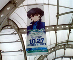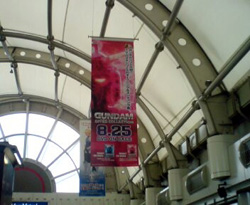 | ↓駅の構内。 うわ、天井からも何かぶら下がってますよ? ガンダムだふるおーですな。を、ファーストも? いくつぶら下がってんだ? 取りあえずキャラ名は知らないが激写!激写! 皆、一斉に改札目指しててノンキにあちこち写真なんか撮ってんのはおいら一人で、 気がつけばそこらにはひとっこ一人居ない状態に(笑) しかし国際展示場駅って、こういった展示物を予測して上手く作られた駅だなあ・・・といつも思う。 流石は駅名に「展示場」が入ってるだけのことはあるな。