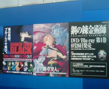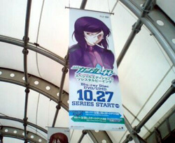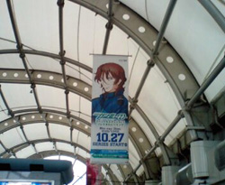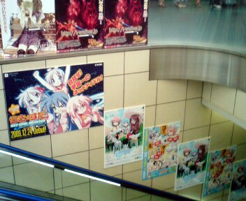 駅の壁一面も同じく、アニメ一色! それも激写。(と言っても写りの悪いおいらの携帯でですが) |