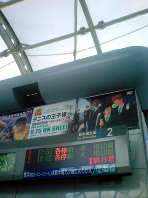 | 店を出まして、ゆりかもめDE帰宅チームと、飛行機でお帰りになる方のお見送りDE品川へ行くぜ!チーム(そこで更にお茶) 帰宅チームに別れました。 自分は品川はかなり遠いのと翌日は仕事だったので帰宅致しました。 国際展示場駅へ。 そして上の写真。(駅の天井からぶら下がってるアレ) それをみなさん、撮影始めました(笑) をう、よく見れば時刻パネルも夏コミ仕様に! そして駅のホームで皆さんとお別れして帰宅の途につきました。 |
