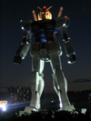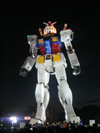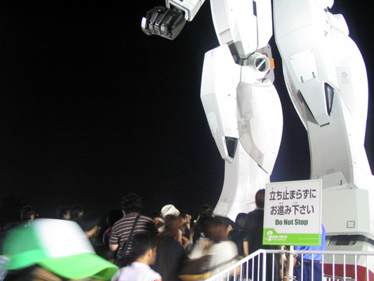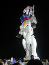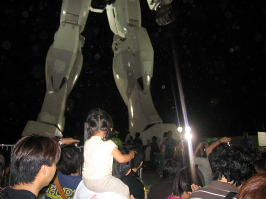 | 定時に仕事を終え「これからオレはお台場にガンダムを見に行く!」と意気込んだのは、8月15日(土)の夕方。 夏コミの翌日でありました(笑) ええ・・・・・・もうすでに疲労困憊、身体は寝たがっているのに(その言い回しはどうかと)心は既にお台場でした! 「母はこれからお台場にガンダムを見に行きます」 と息子にメール。夕飯のカレーはもう作ってあったし「これはもう行くしかないだろう?」ってなもんで。 以前ネットで見た「夕焼けガンダム」が忘れられなかったのです。 「これからなら見れる!夕焼けの中にたたずむガンダムをっ!」 と電車に飛び乗りました。 そしてハタと気がついた。 「あれ?ガンダムがいるとこってどこだ?」 携帯で探すも肝心の降りる駅名を書いてるブログ等がヒットしない! 「お台場海浜公園駅?」そう言えば「青海」って駅、確かお台場に近くなかったっけ? わかんねえ!こうなりゃ頼みの綱のあさぎさんにメールだ! 「どこの駅で降りるの?」 『りんかい線なら東京テレポート。ゆりかもめなら台場だよ』 ほぅ♪そういや「台場駅」てのがあったっけ?(田舎者) しかも 『会場限定ガンプラ(1500円おひとり様一個)があるよ』 と写真付きでお返事が!あさぎさん、サンキュー。 うううっっっ!!欲しい!欲しいぞ!ガンプラ! 血が燃えたぎってきた! 待ってろよ!お台場ガンダムーーーー!いま行くからなーー! と言いつつ、地下鉄大江戸線の汐留駅からゆりかもめへの道を間違え(あそこの駅、非常に分かりにくいよー!) 15分ほどロス。 ゆりかもめに乗った頃にはもう夕日が傾くなんてもんじゃない!沈む寸前だよっっっ! しかもゆりかもめってスピード遅いし! 脇を走るファミリーカーにどんどこ追い越されていってますよ(クチビル噛み締め) そして台場駅に到着。 凄い人波・・・・・。どっちへ行ったらいいんだろうか? と、きょろきょろしてると台場駅。入場(乗車)制限始めました!帰る人でごった返してるもん。 フジテレビ近くで看板持ってるお姉ちゃんに「ガンダムはどっちですか?」と聞き、あとは人の流れについて行きました。 そして会場の公園内を歩く・・・・・・・ うおっっっ!ガンダムのBGMが聞こえて来たよぅぅ(号泣) あれは「長い眠り」だ!そして「戦いへの恐怖」が聴こえてきた辺りでもう鳥肌が立ちました! 足元暗闇なんですが、小走りです! ああーーーーーっっ!目、光ってるよーー! とここら辺りでやっと会場入りしました。 会場内は凄い人で!しかもそれらの人々の視線は全てガンダム(上空)に向けられているというあの光景を目の当たりにして、 背筋がゾクリました。 みんなが上を向いてるのをいいことに「はい、ごめんなさいよ♪」とスイスイ前に出て少しでもガンダムの近くに寄ろうと言うこのせこさ。 『こいつ動くぞ!!』 多分みんな心の中で呟いたんじゃないかなあ・・・・ 首が左右に動くわ最後にゃ上を向くわですっげえ! そんでミストがあちこちから噴出されてるんですが、それがライトの光と相まって幻想的でとても綺麗☆ はぁあぁ〜〜〜〜・・・・・大満足だよ。 と感動しつつデジカメ、携帯カメラを連続でシャッター切り。 ふと周りを見れば、老若男女がワラワラと。 おじいちゃん。ガンダム動かしてるパイロット、なんちゅう名前か知ってっか? アムロって言うんだよ?え?歌を歌ってロボットも動かすのかい?・・・・・・ってそりゃ安室ちゃんだっつの、じいちゃん。 なんてバカなこと考えてたり・・・・。 会場内を見回すと、三脚持参者の多いこと! 若い女性までもがしっかりと三脚を備え付け、しきりにシャッタ−切ってます。 気合いが違うな! ひとまず心おきなくシャターを切り続けたおいらの次なる目的は 『ガンダム股くぐり』もしくは『ガンダムお触りバー』という名の(勝手につけんなよ)『ガンダムタッチ&ウォーク』って奴です。 をを!あそこに見えるのはどこぞの会場でよく見掛ける「最後尾札」じゃん―☆(上記写真参照)