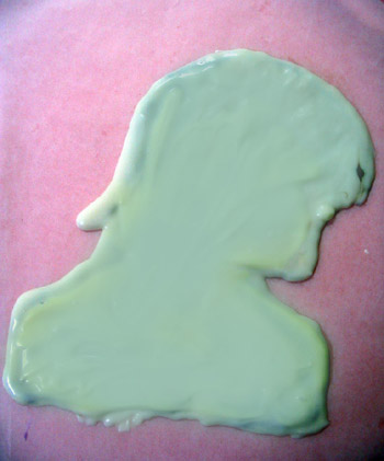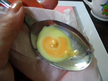 「チョコは湯せんで溶かす」のが正しい。 だけど面倒なのでスプーン(大)にチョコを垂らし、色を作る。 始め、スプーンを熱湯に浸け温めてからチョコを垂らしてみた。 ←コレはヒカルの肌色を作ってるところ。 すぐに固まるので、ホッカイロの上にスプーンを乗せて作業しました。 |