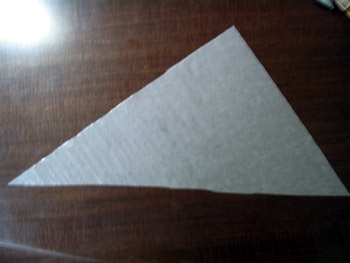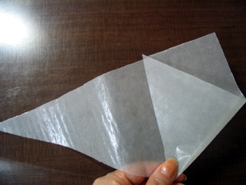 チョコペンで描き始めたが、やはりムリだった。 先っぽをハサミではなく針で突いて穴を開けたのだが、やはり描いてるうちにスグ詰まる。 線を一本描いては詰まってる様子。 チョコが凄い勢いで固まって行くからだ。 ドタマに来て先っぽをハサミで切った。 ・・・・・・・・・・ やっぱ線が太すぎるよ、ママン。 鉛筆みたいに持てて、描くのは非常にラクなのだが・・・・チョコペンで描くのは諦めよう。 なのでイザと言う時の為のパラフィン紙(本当はグラシン紙がいい)出動。 (文具屋さんで買った。100均で売ってるらしいが近所の100均、つぶれた)) 紙を適当に三角に切る。 |